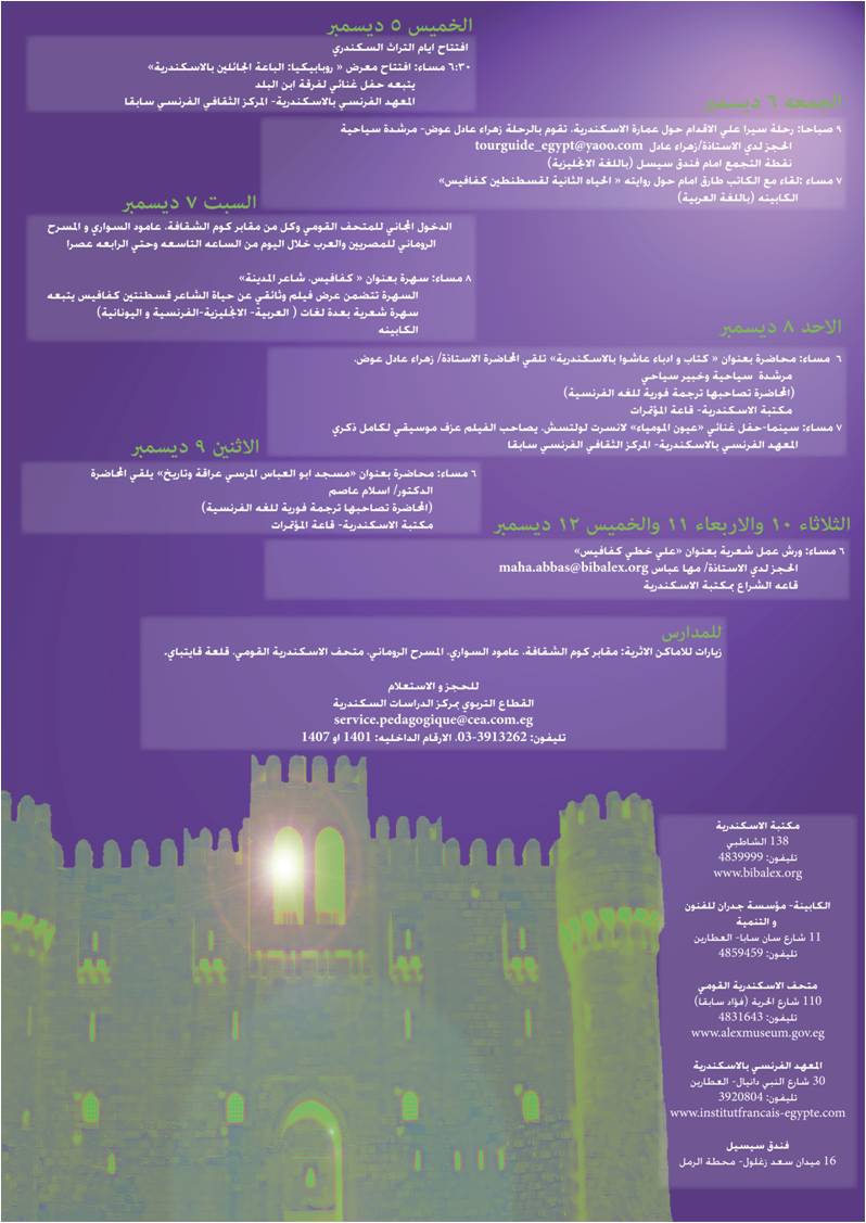 In this context, the BA Francophone Library hosts on 8 December a lecture by Tour Guide Al-Zahraa Adel Awad on writers who lived in Alexandria, and on 9 December another lecture on El-Morsi Abu El-Abbas mosque by Dr. Islam Assem Abd El-Karim.