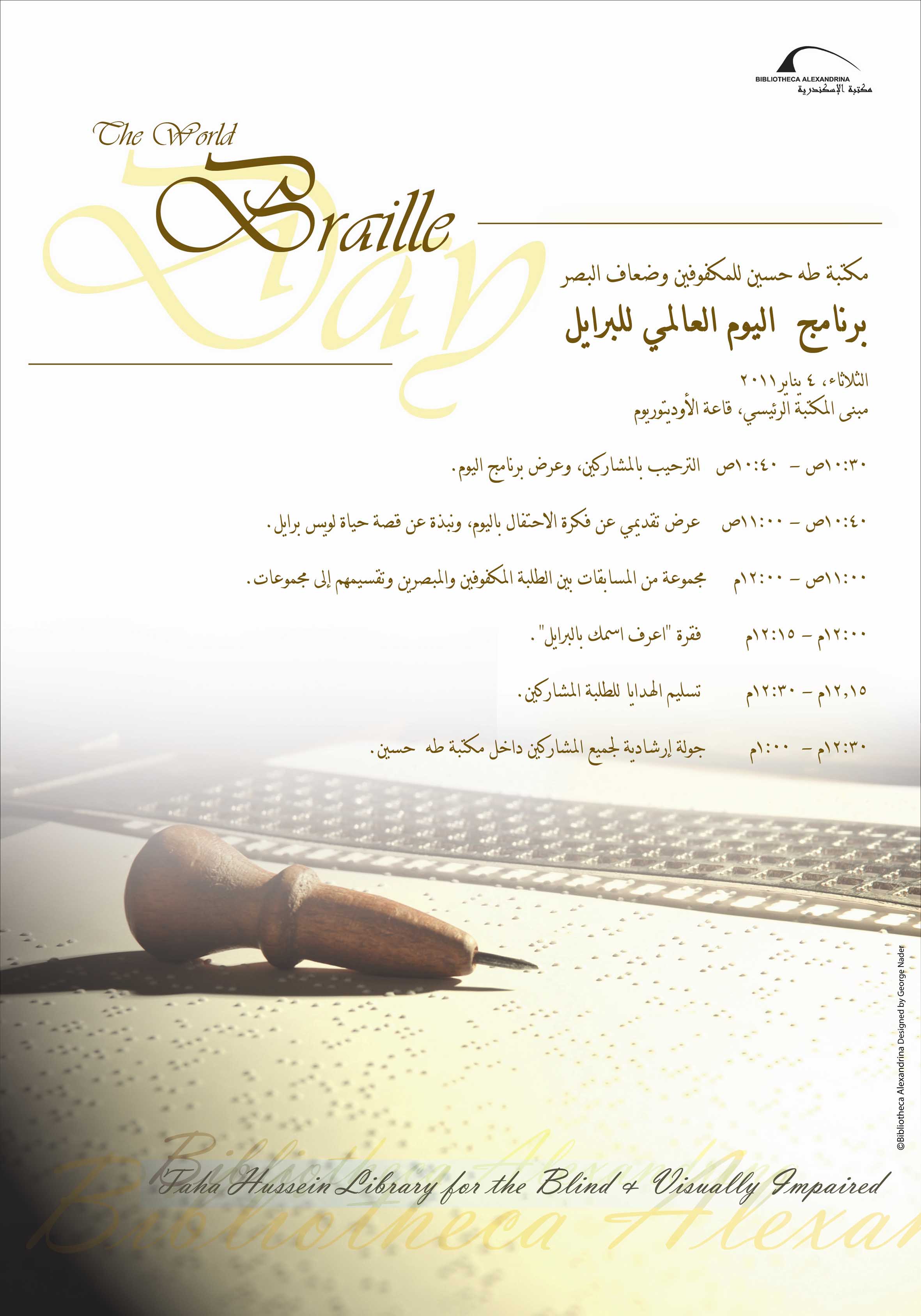 La Bibliothèque Taha Hussein pour les Non et Malvoyants de la BA organise le 4 janvier 2011 une célébration à l’occasion de la Journée Mondiale du Braille.